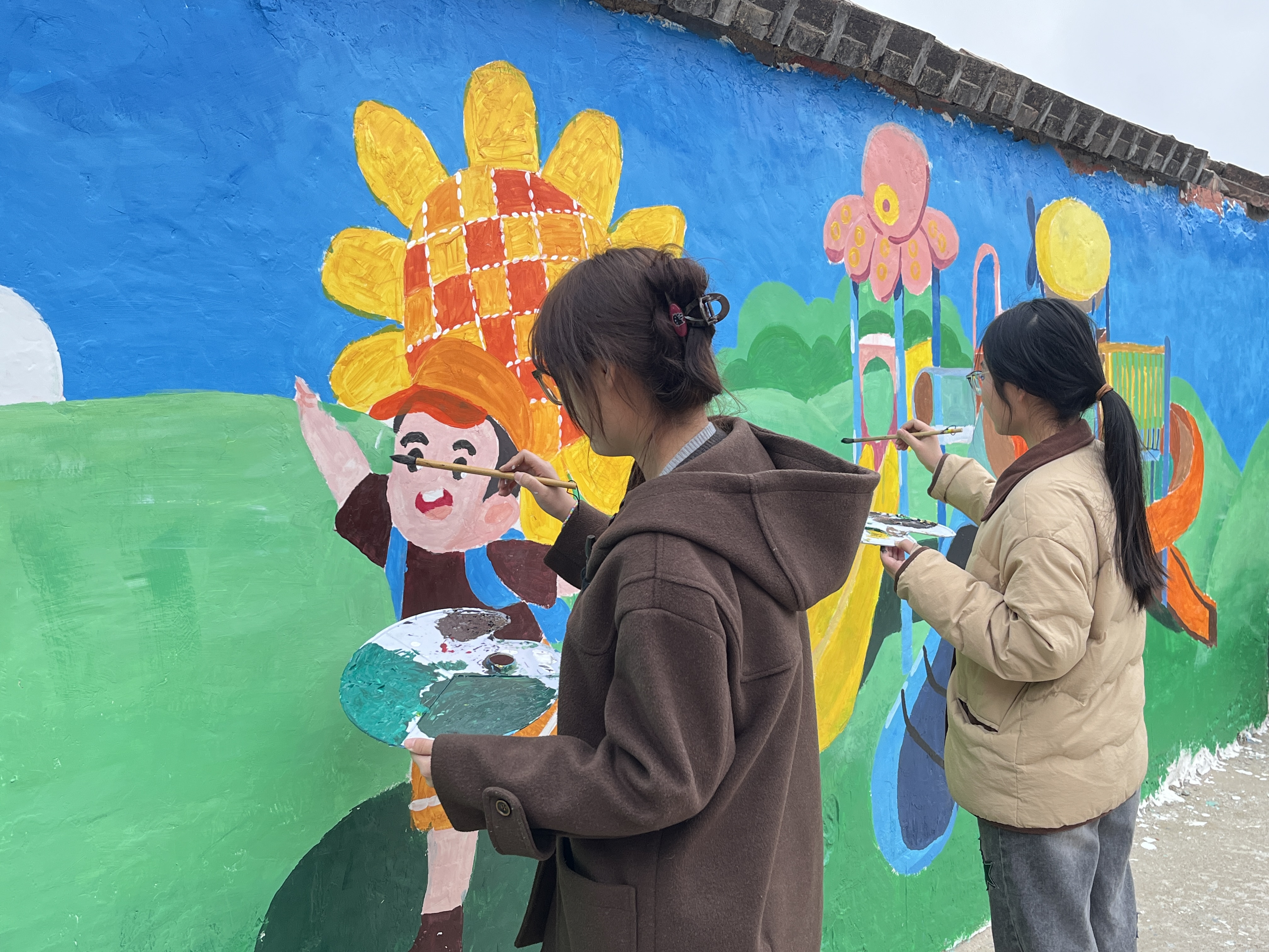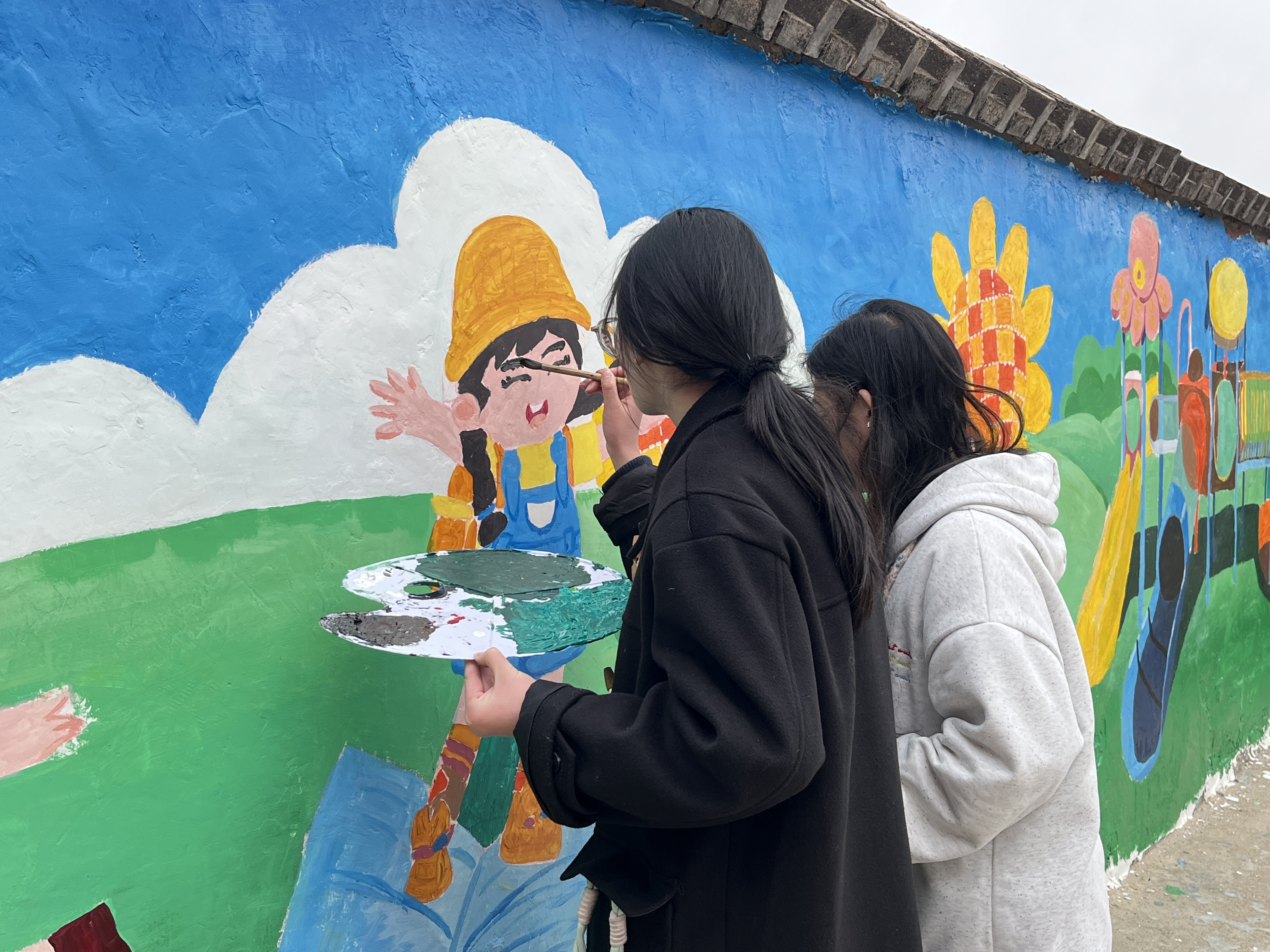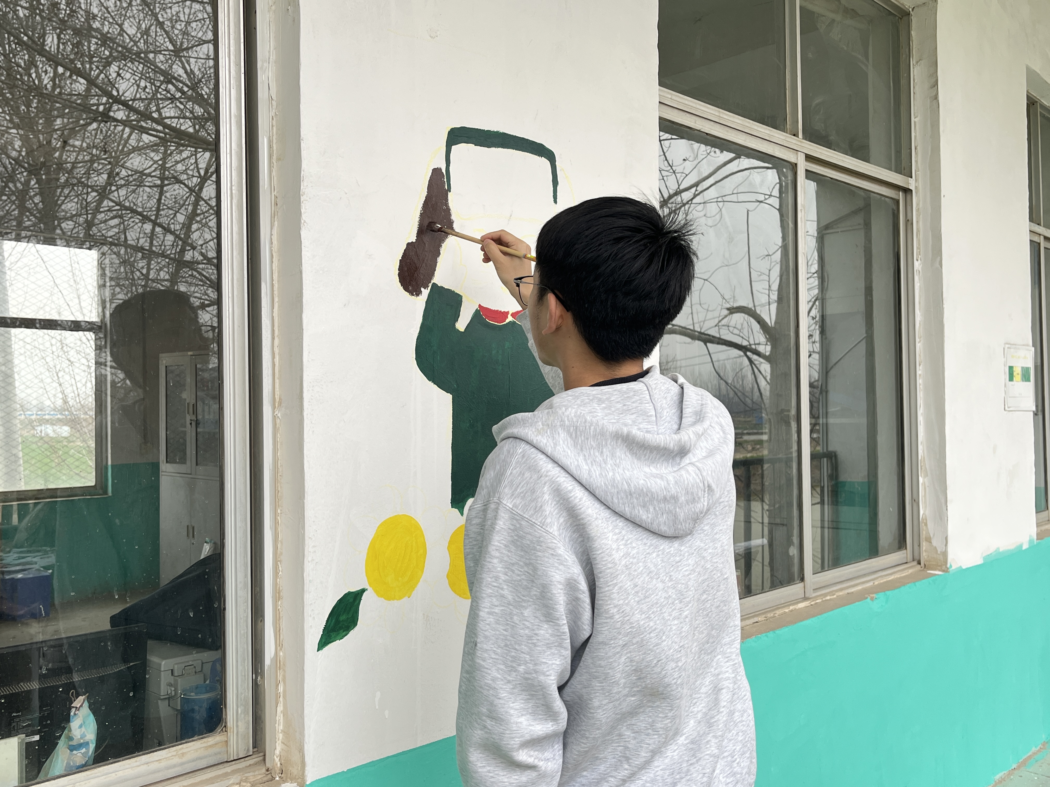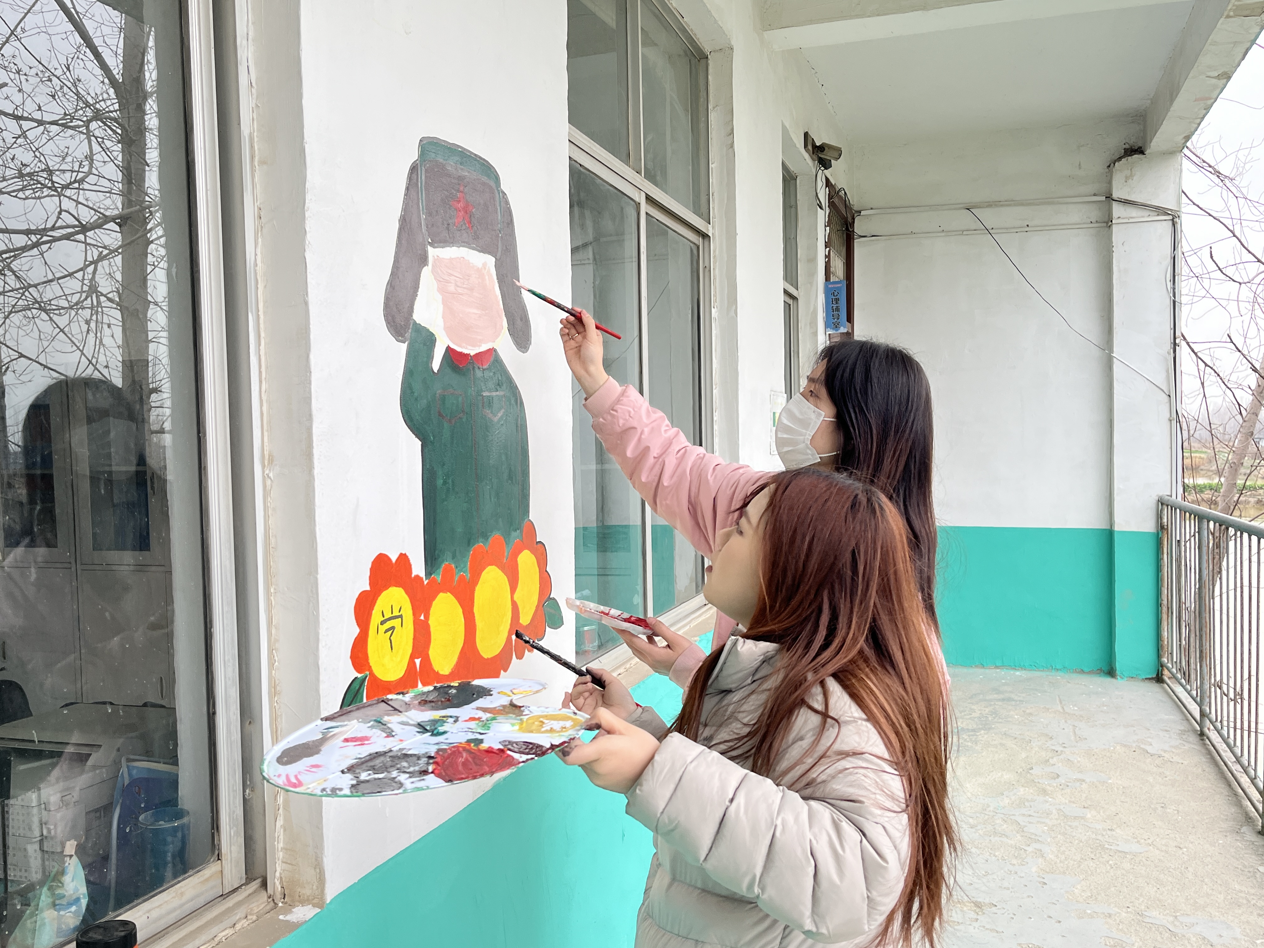 学雷锋,妙笔添彩绘校园。在校园门口,员工党员们充分发挥小学教育专业专长,志愿为田庄小学精心绘就七彩墙绘。大家手持画笔、颜料等工具,以饱满的热情投入墙绘创作中。
