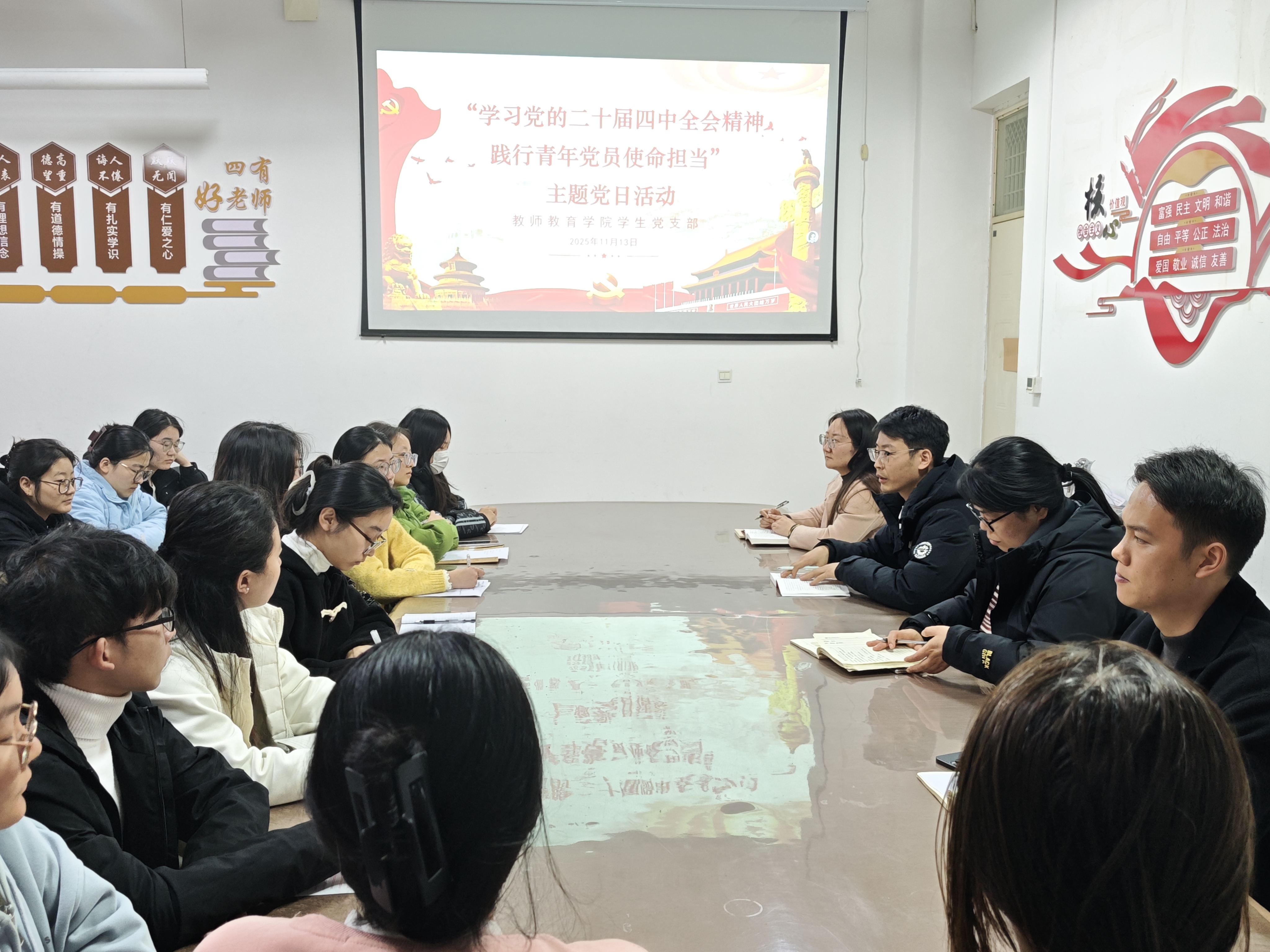 11月13日,beats365员工党支部在汉梁楼203教室开展“学习党的二十届四中全会精神 践行青年党员使命担当”主题党日活动。员工第二党支部书记张旖旎主持会议。