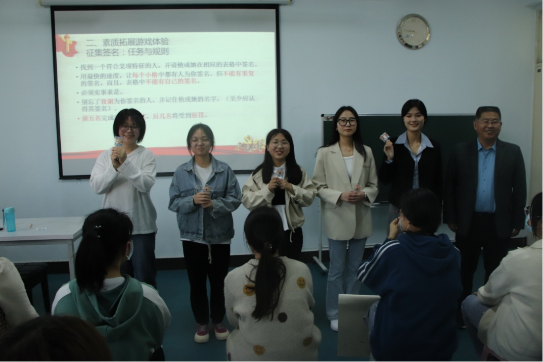 团体心理拓展活动主要包括三个环节:征集签名,同时蒯秀丽根据员工游戏过程、游戏结果等方面进行剖析;团队建设游戏,各团队需要在短时间内“破冰”后共同进行创作,20分钟后各团队展示作品;群口相声,员工自由组队并按游戏规则合作完成规定的台词。蒯秀丽围绕个人与团体之间的关系处理,设计游戏环节,引导同学们在游戏活动中尝试沟通、表达,学会信任。最后,邱友谊与表现优异的团队进行合影。