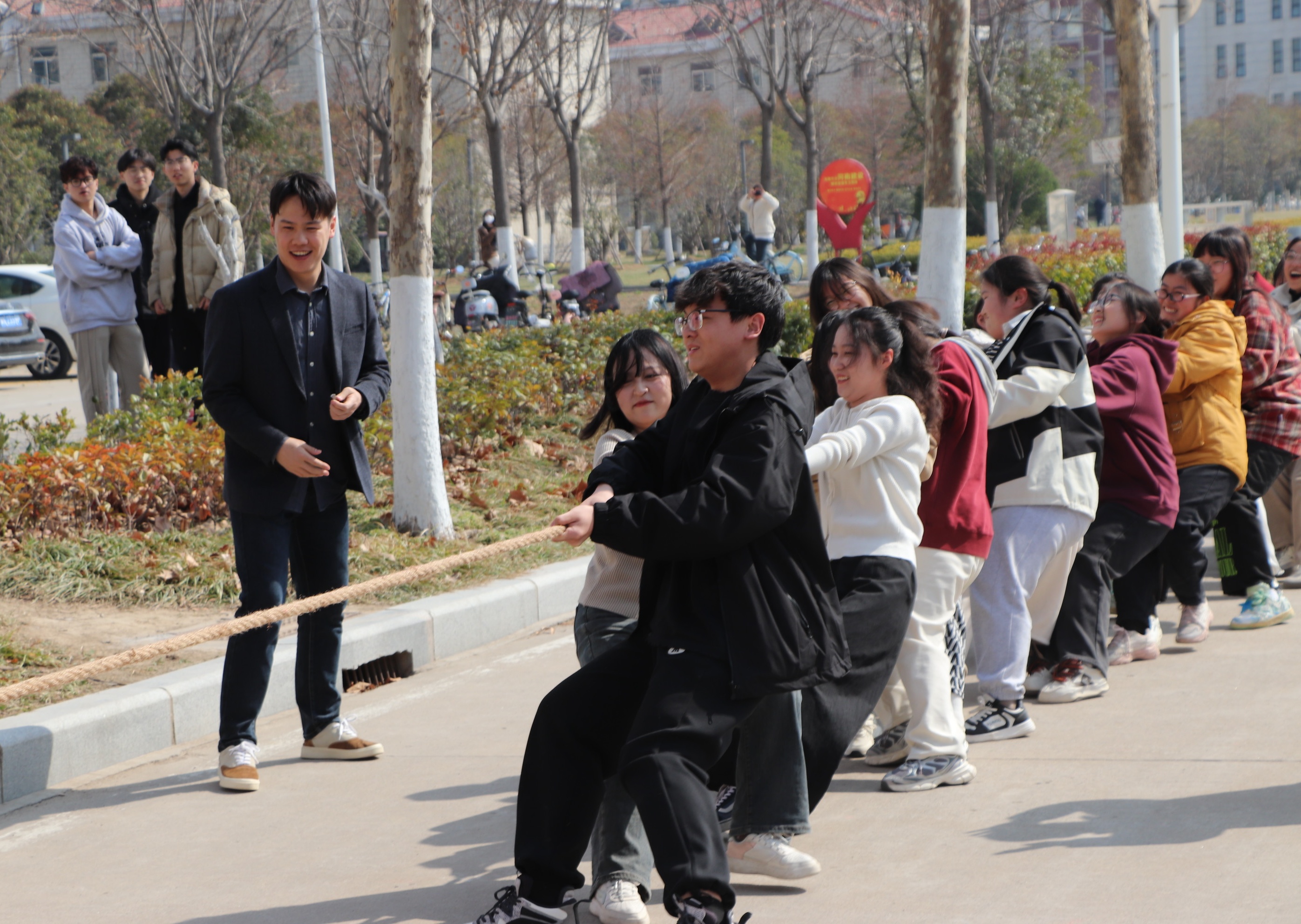 为进一步丰富校园文化生活,增强员工的团队精神和集体荣誉感,营造文明和谐的校园氛围,3月15日,beats365在汉梁楼西门举行 “凝聚班级力量,共创文明校园”拔河比赛,公司党委副书记邱友谊、团委书记董若颖,全体辅导员位临本次比赛现场。