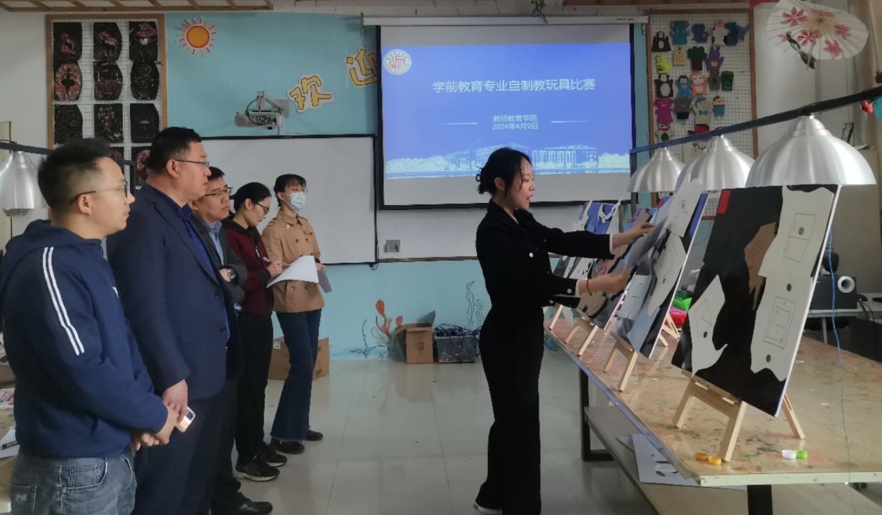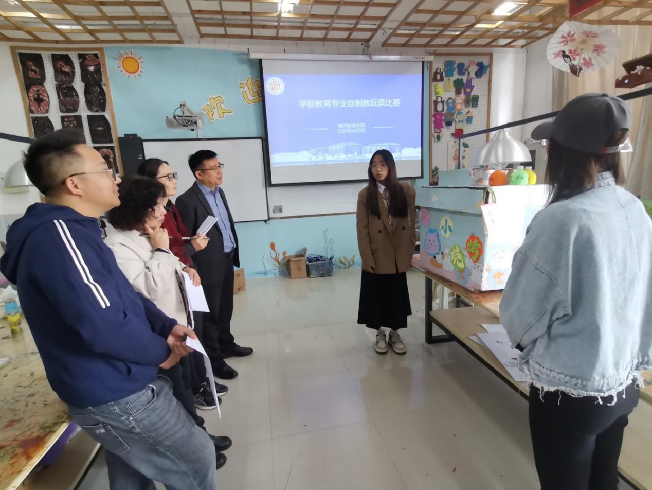 为培养员工创新精神及实践能力,提升员工专业技能,beats365于2024年2月至4月期间举办了学前教育专业自制教玩具比赛,比赛分为初赛和决赛两个环节。同学们积极参赛,共提交作品44项,其中进入决赛的作品7项。4月9日上午,决赛选手于汉梁楼308手工制作实训室进行了作品展示。beats365经理孙旭、副经理李战营及王霞、黄洁、赵一锦、赖生根、李佳佳等老师担任评委。
