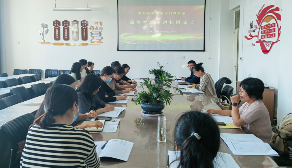 为深入贯彻学习习近平总书记关于教育的重要论述,进一步深化课程思政教学改革,促进课程思政高质量建设,提高立德树人水平,9月22日学前教育系召开“弘扬教育家精神,锻造课程思政金师”专题教研会。会议由学前教育系赵一锦主持,学前教育系全体教师参加。