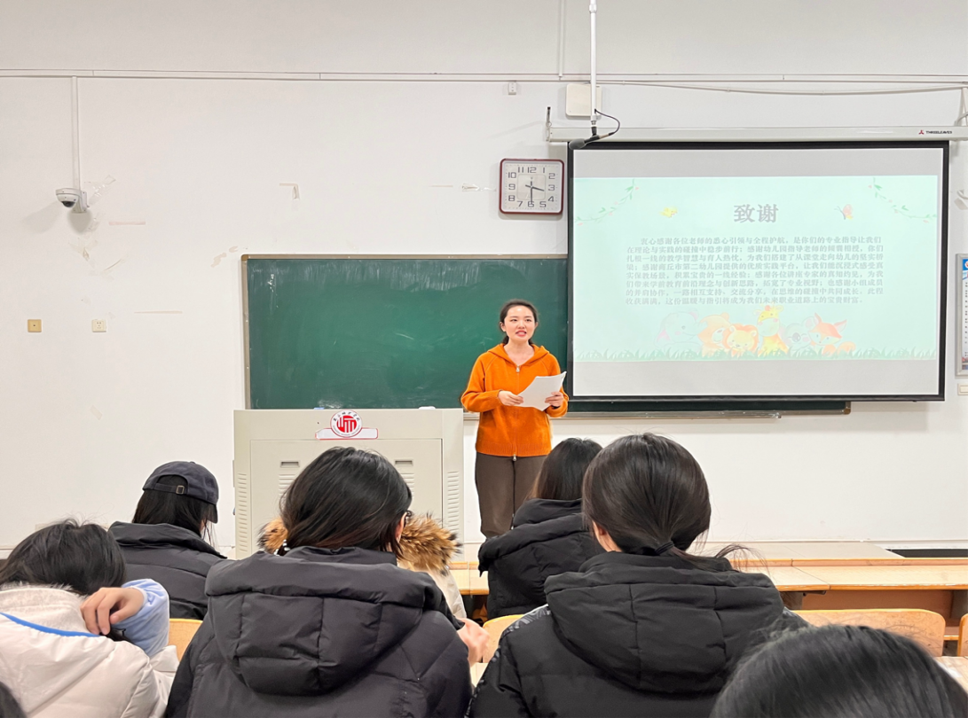 活动的最后,班主任宋泊文老师站上讲台带来暖心总结。宋老师不仅向指导师范生实践的幼儿园一线教师与公司专业教师表达了诚挚感谢,还特地叮嘱同学们,要把见习中的所见所感与专业理论牢牢结合,在“观察—反思—实践”的循环里慢慢打磨教学技能,始终保持对学前教育事业的热爱,用一次次实践积累筑牢自己的专业根基。